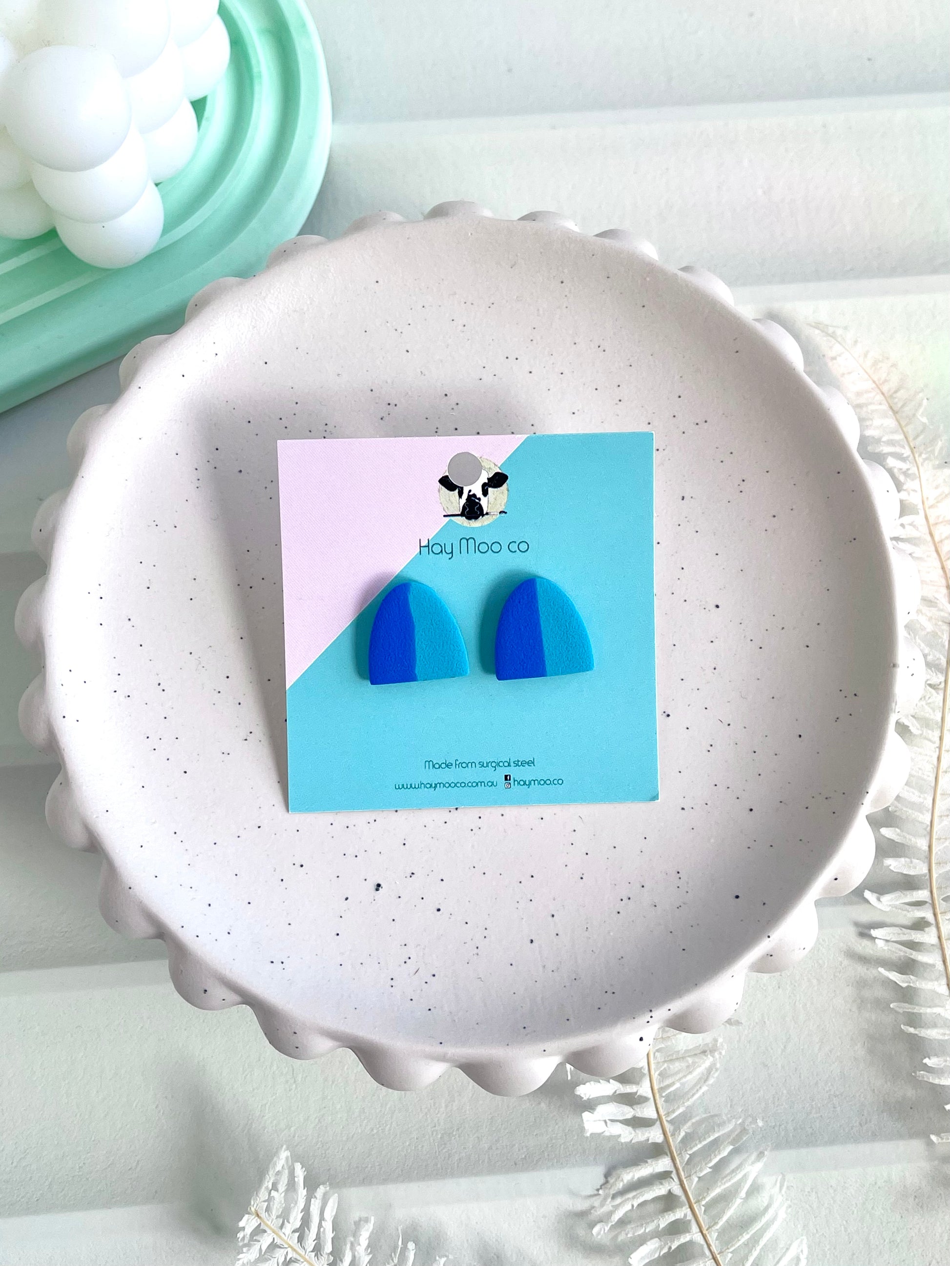 Handmade polymer clay earrings from the 'Blue Stripe' range.