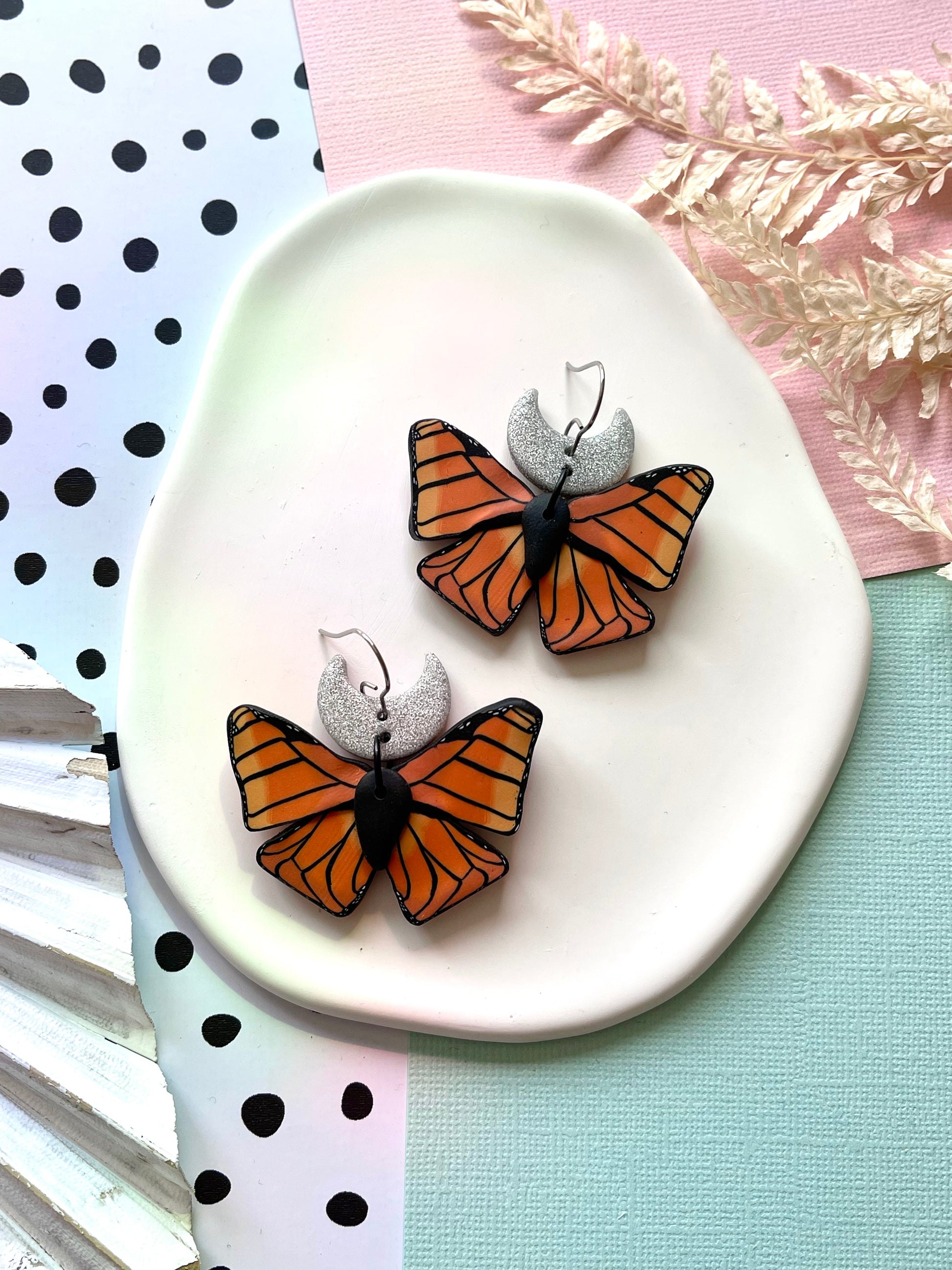 These exquisite handmade earrings feature a monarch butterfly and a shimmering moon charm. A perfect combination of nature and beauty, the Monarch Butterfly Moon Charm Dangle is sure to bring a touch of elegance to any outfit.