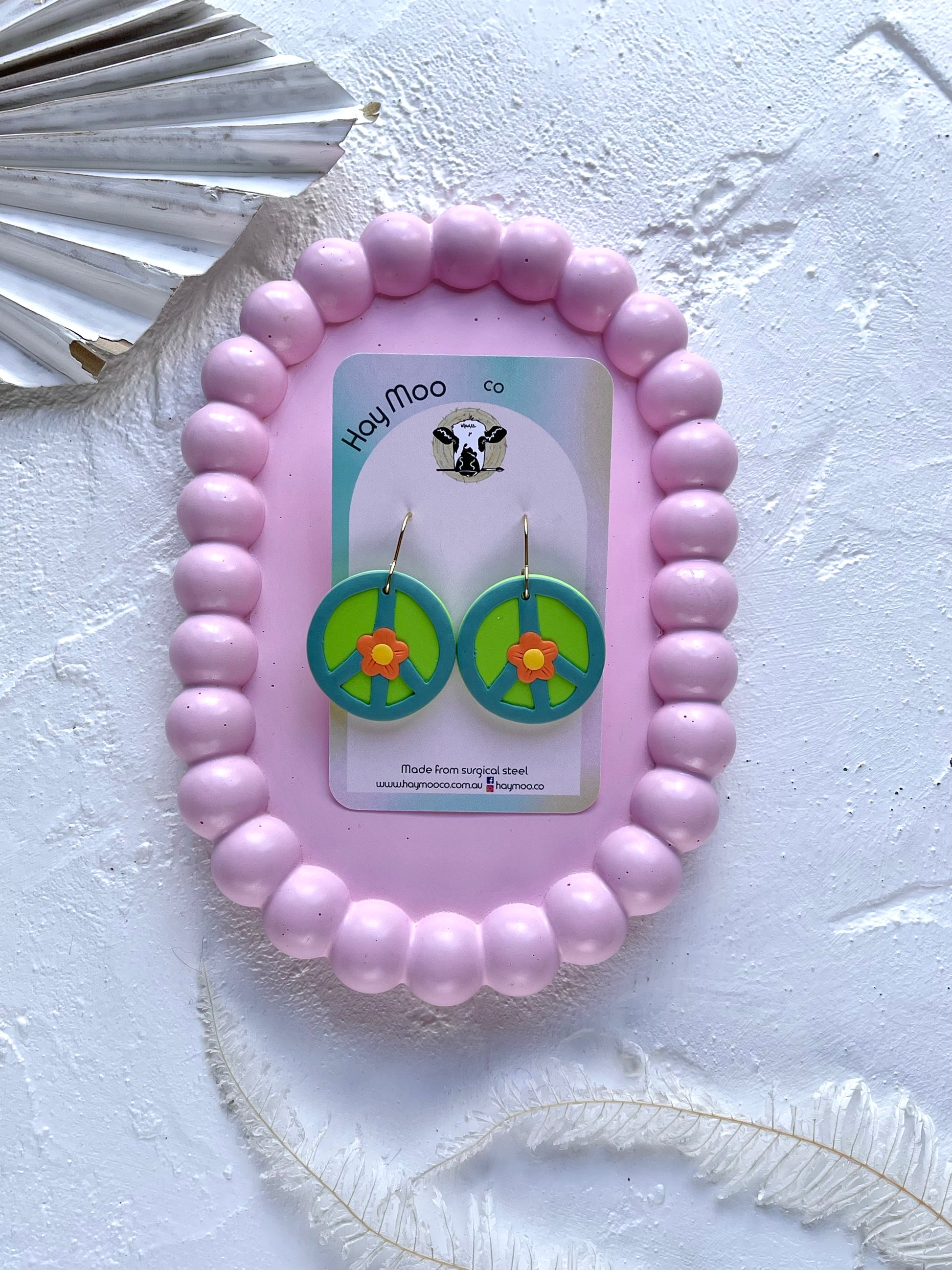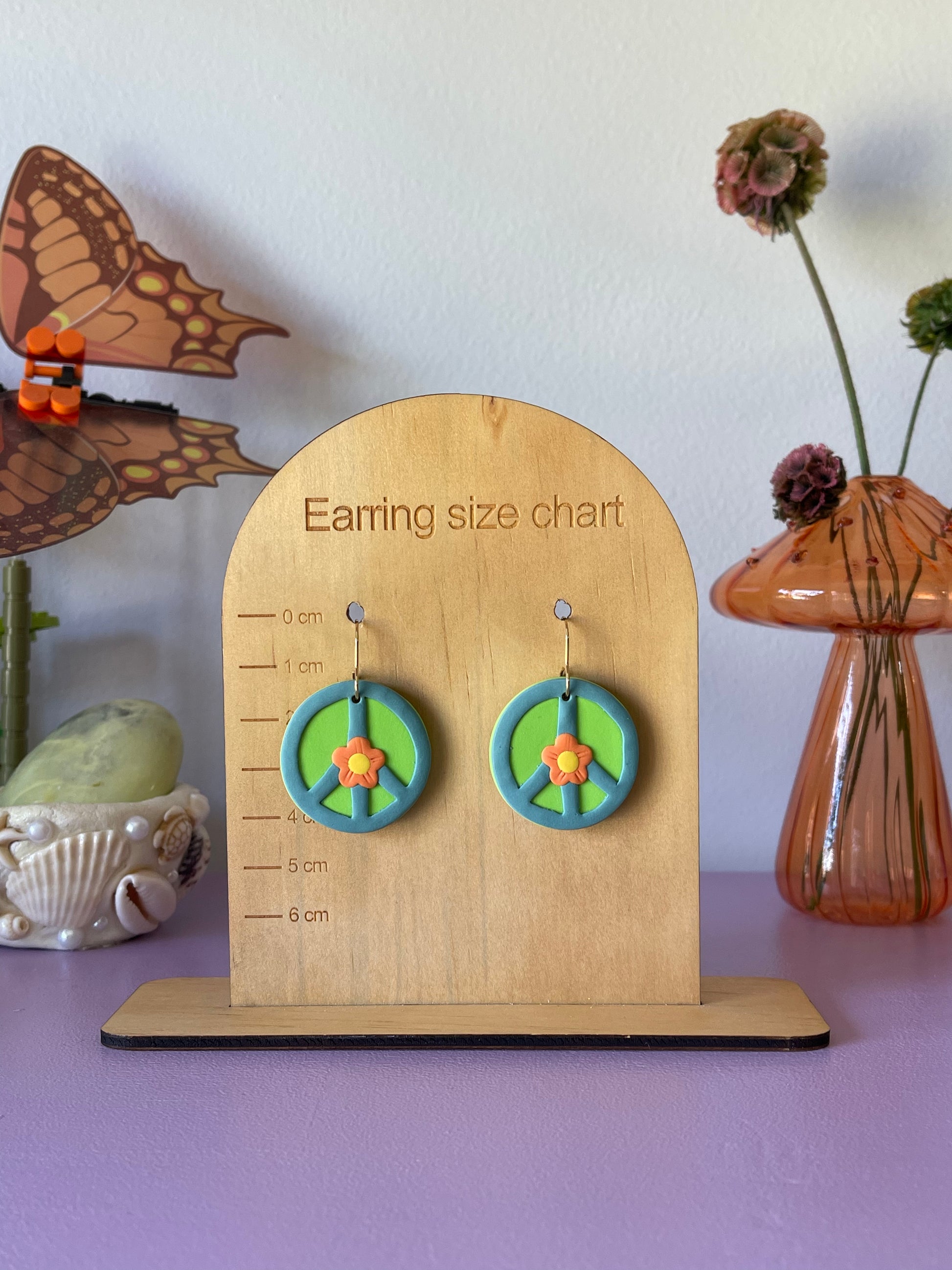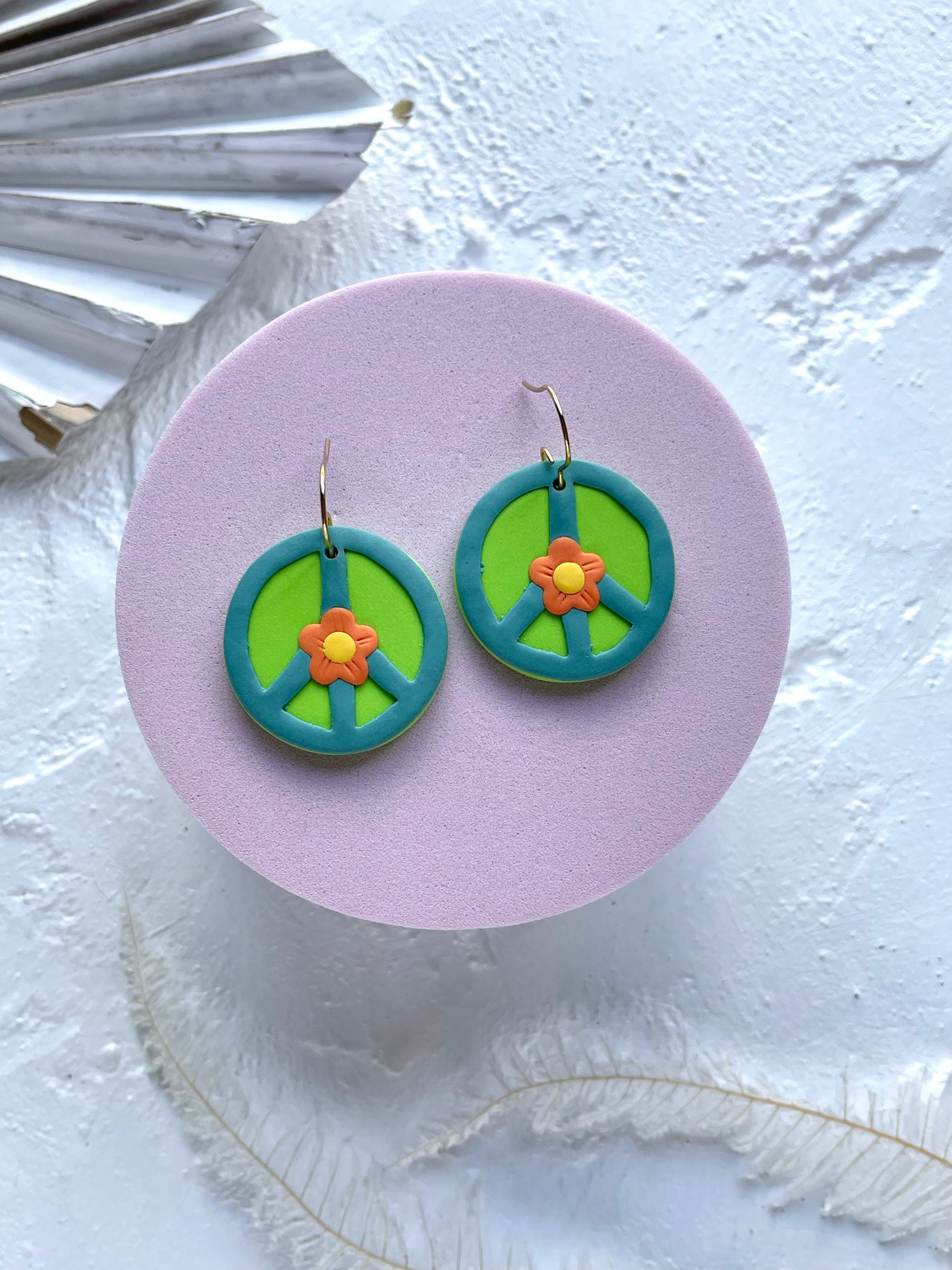 Handmade polymer clay earrings from the 'Peace Sign' range.