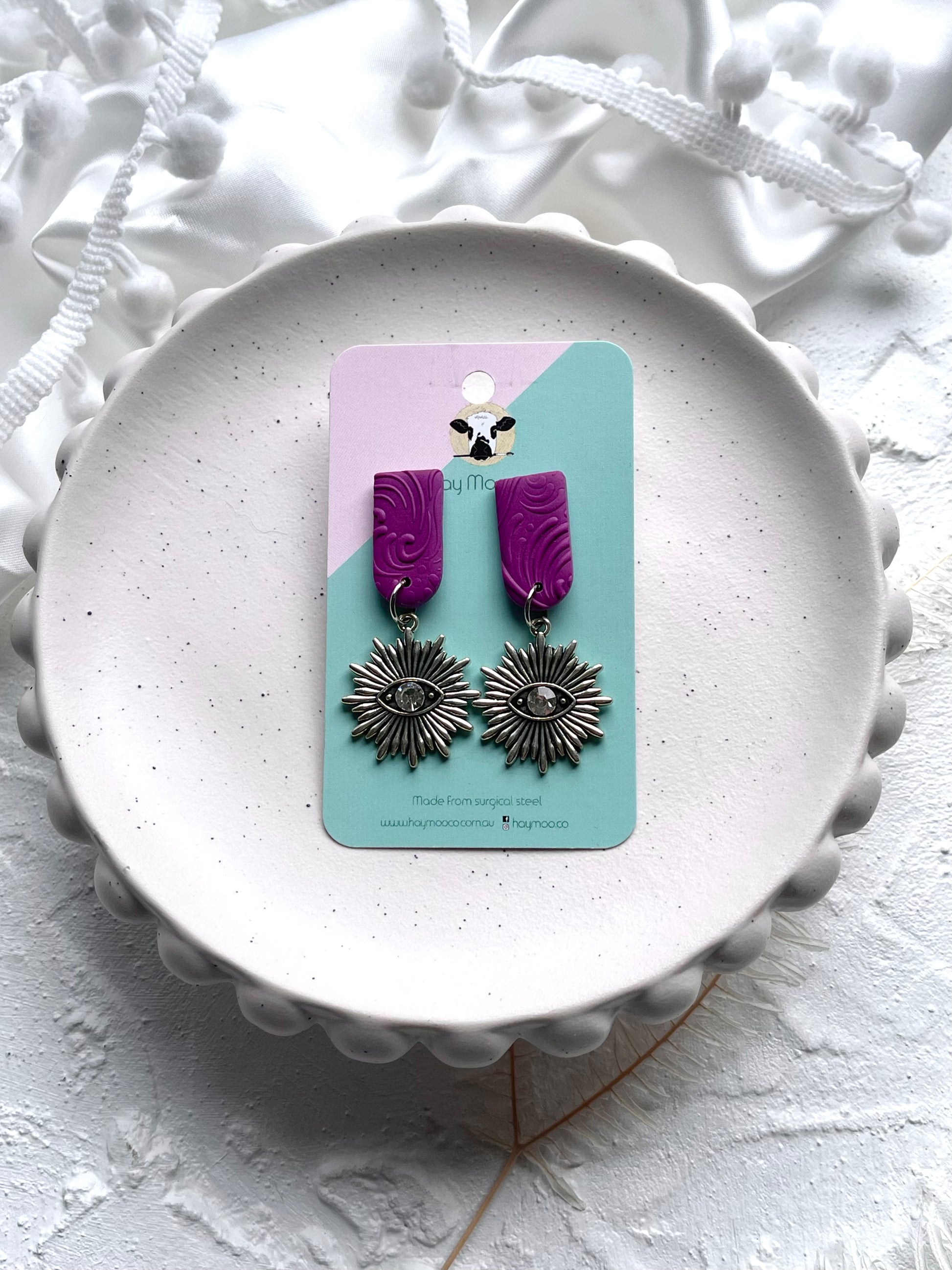Handmade polymer clay earrings from the 'Purple Swirl' range.