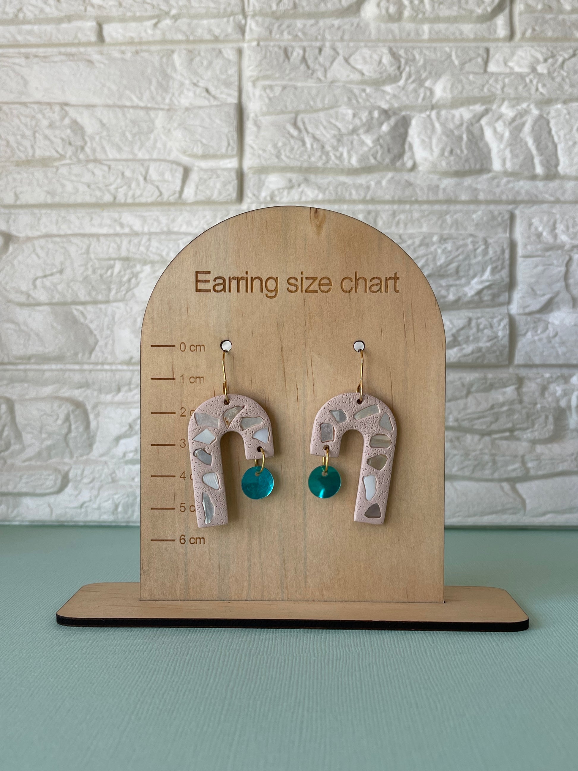 Beautifully handmade 'Shell' Arch Dangle earrings feature an elegant cream coloured arch shape with broken shell pieces intricately indented. Included in the piece is a cyan shell charm, giving the earrings an added touch of glamour and sophistication. Look great on any occasion!