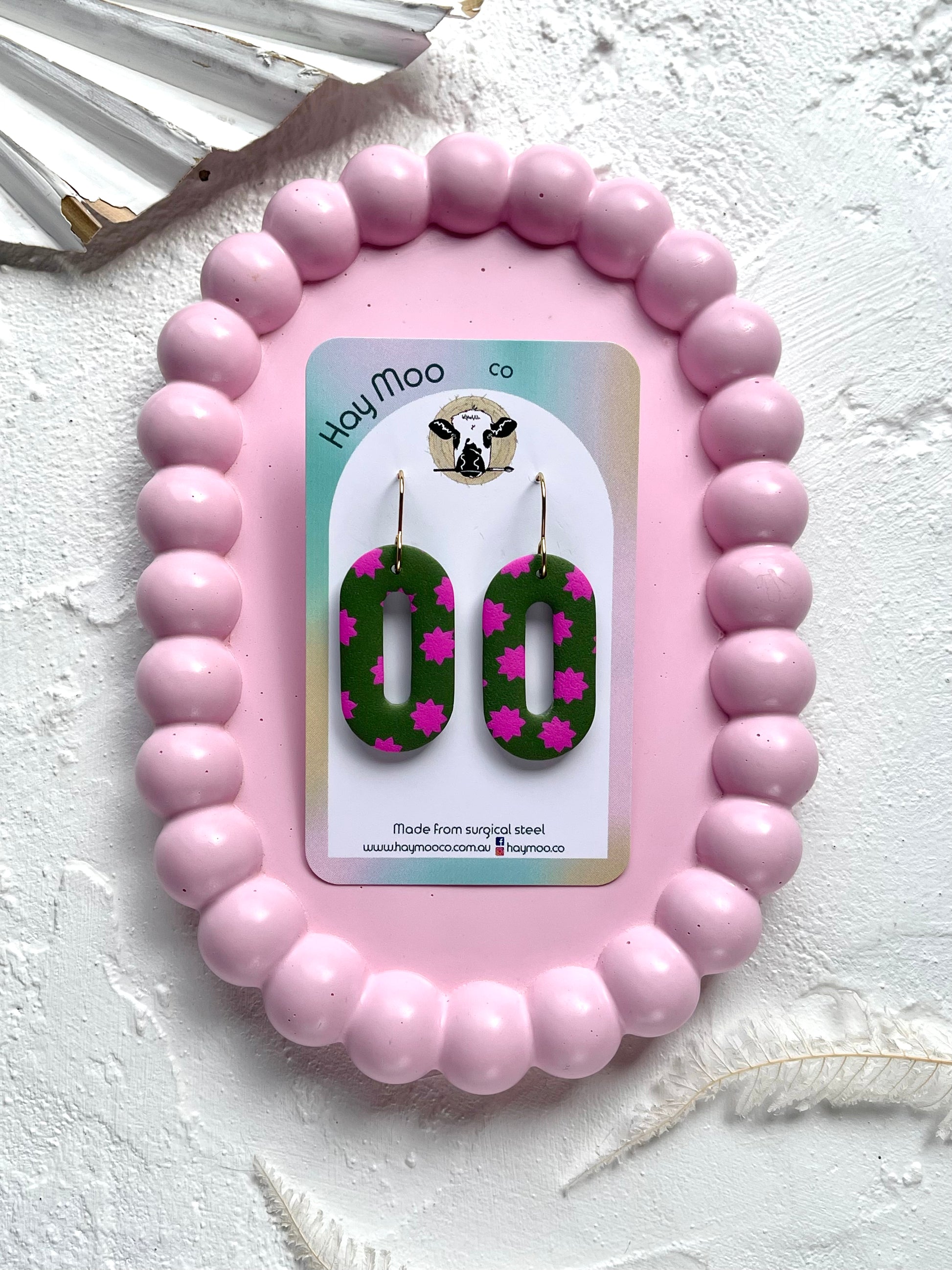 Handmade polymer clay earrings from the 'Star Fern' range.