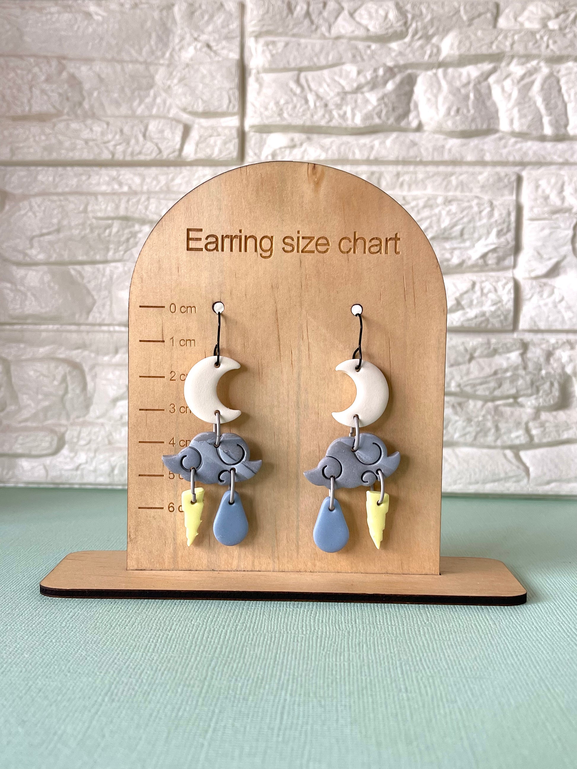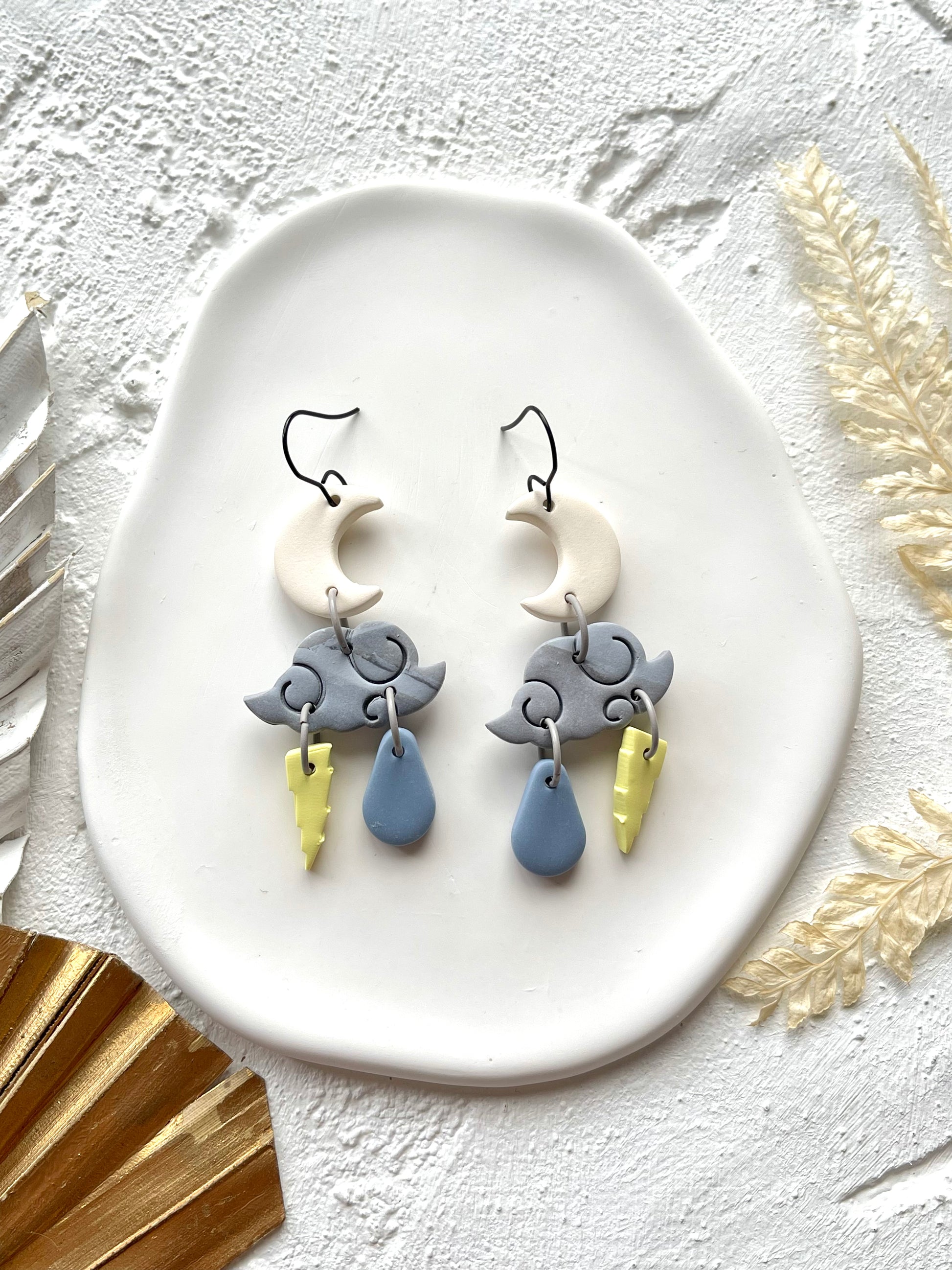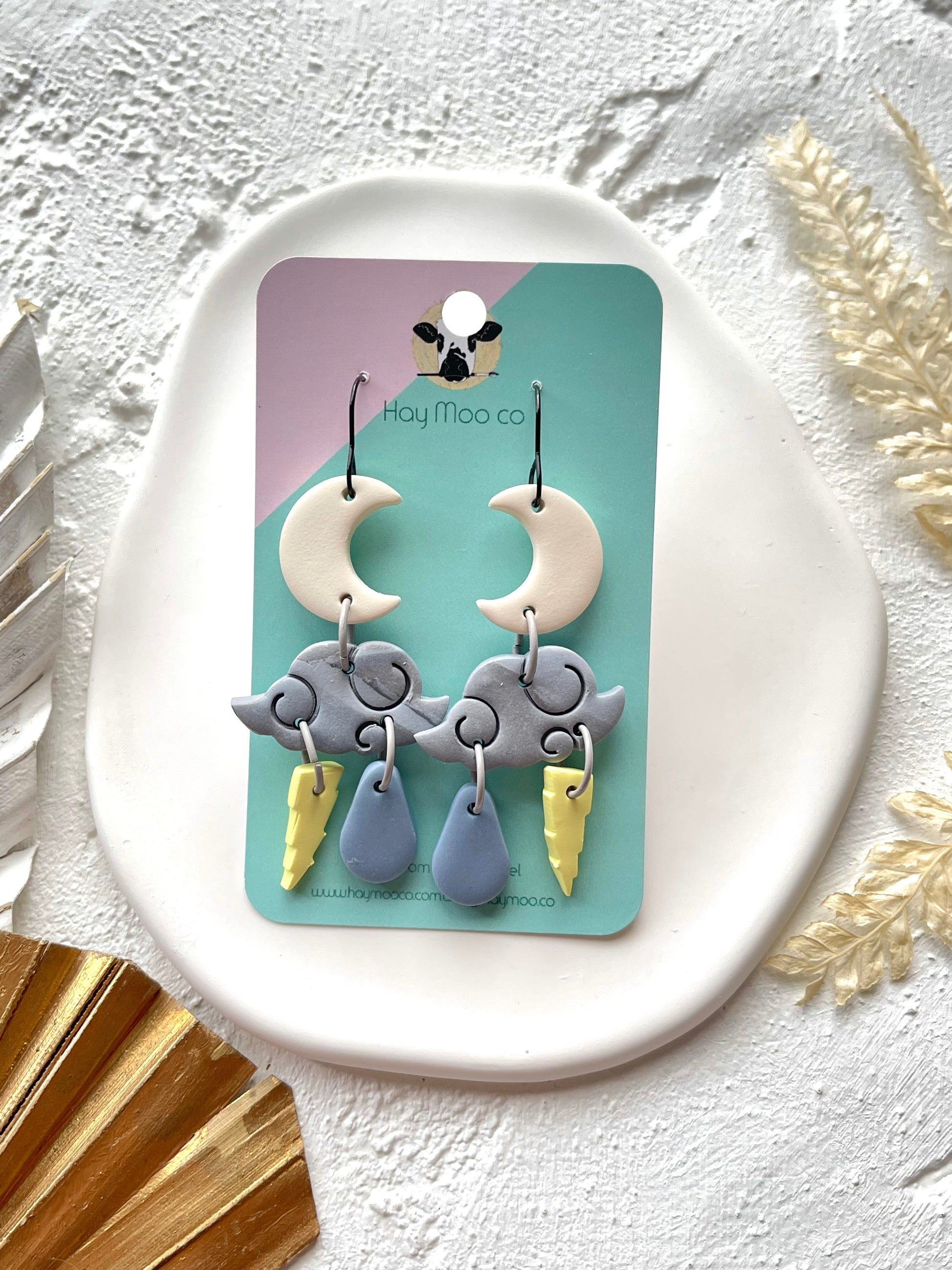 These handmade 'Storm' Swirl Cloud Dangles are the perfect accessory for any thunderous style. With rain, cloud, lightning, and moon features, these earrings make a classic statement for any look. Make a lasting impression with this timeless piece.