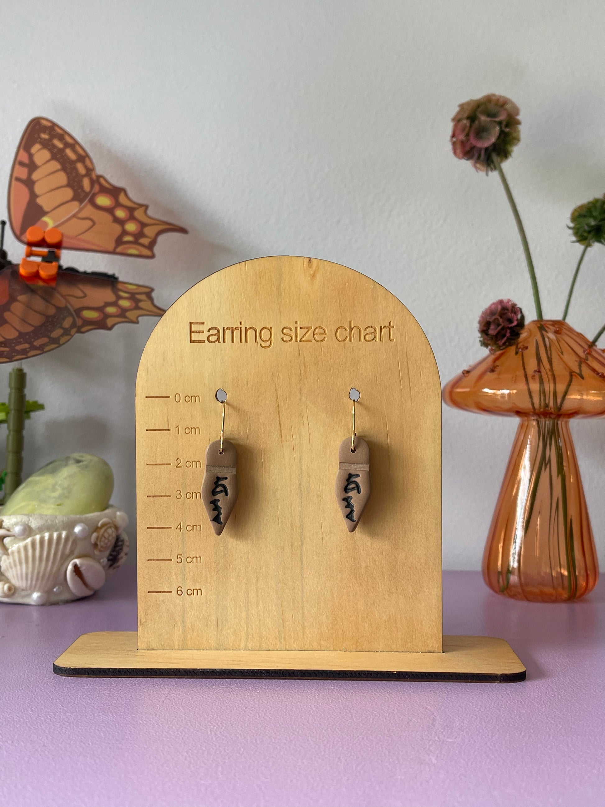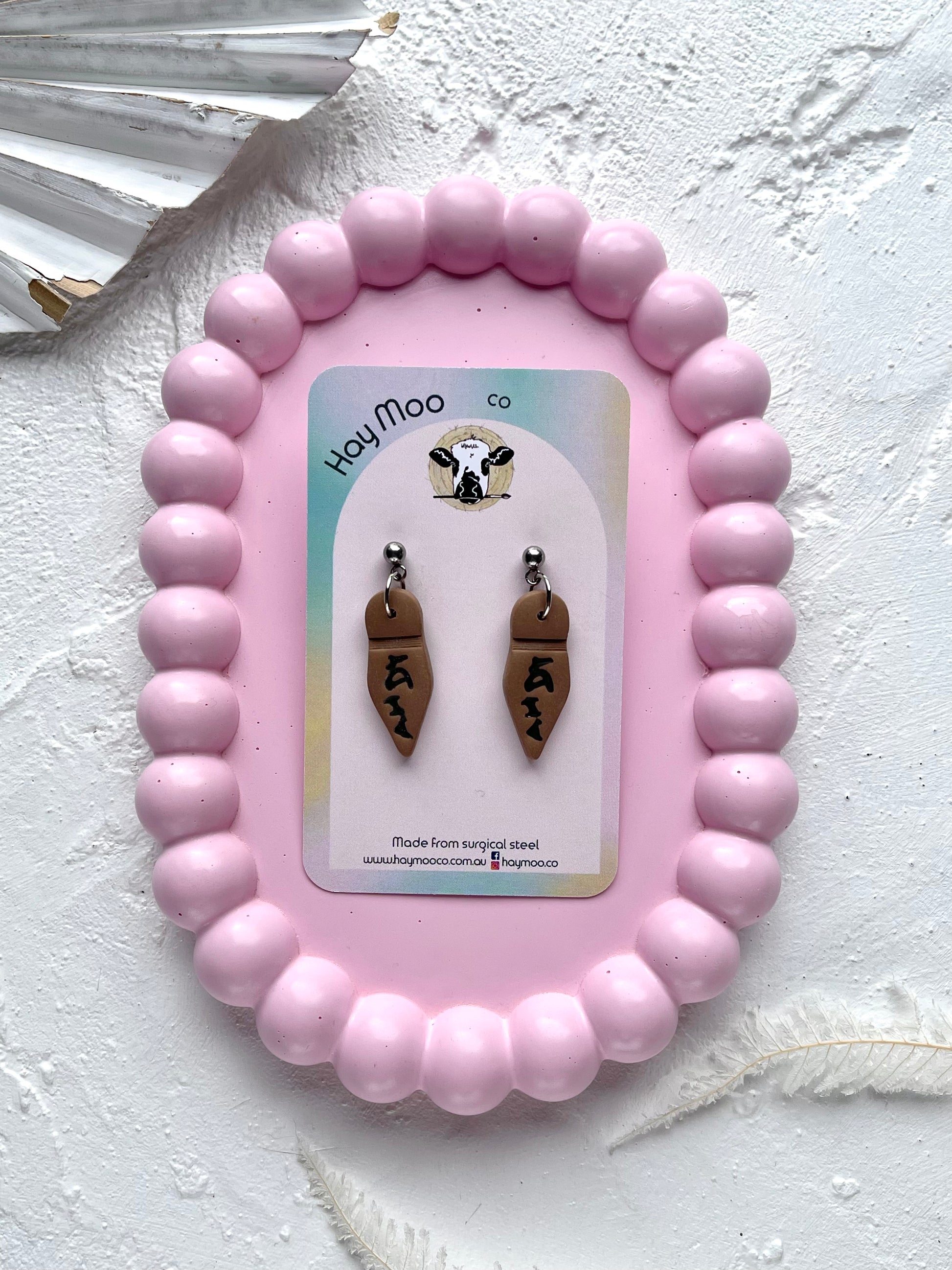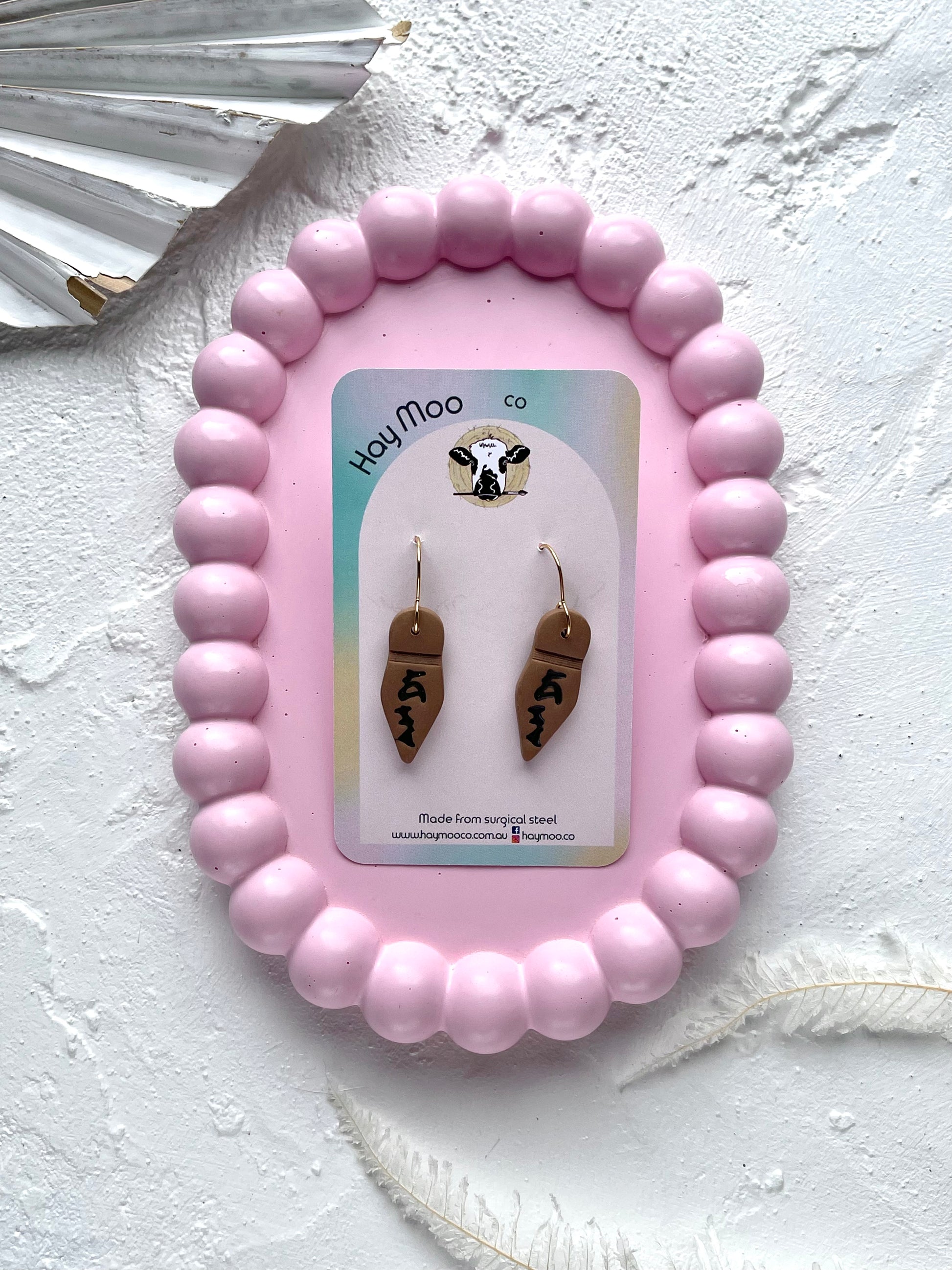 Handmade polymer clay earrings from the 'Woody's Boot' range.