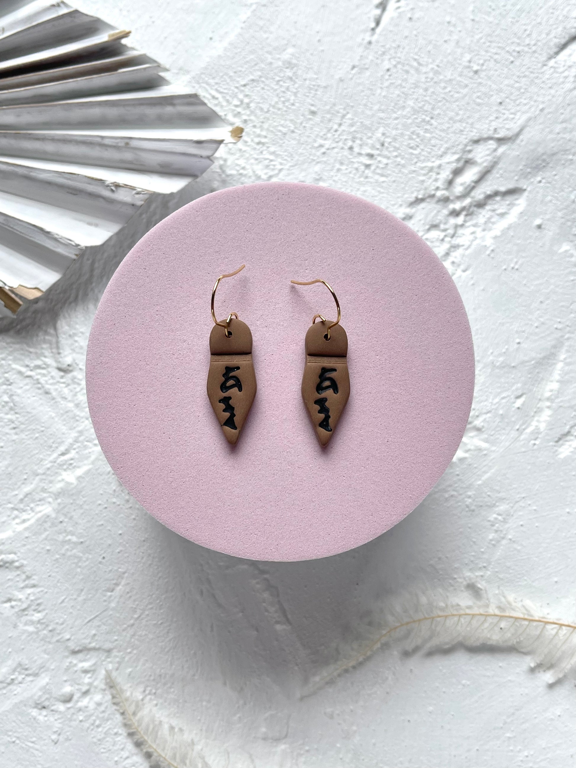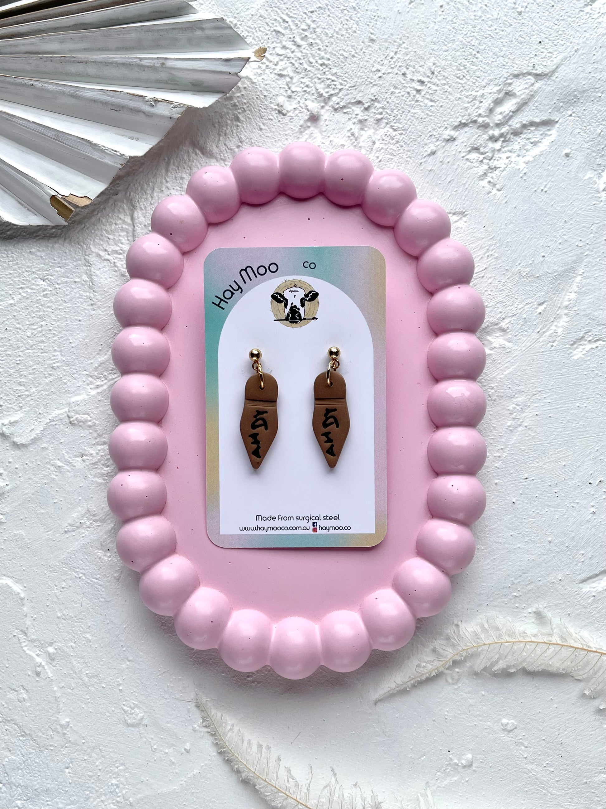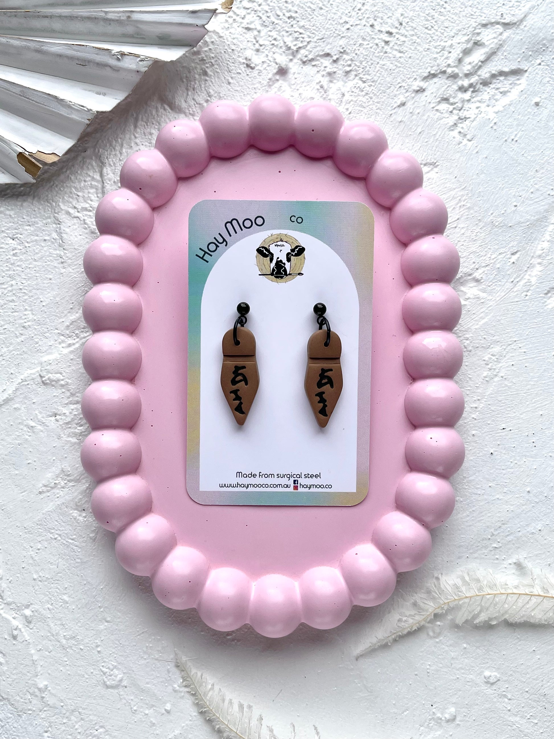 Handmade polymer clay earrings from the 'Woody's Boot' range.